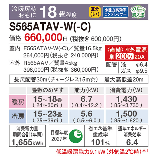 カテゴリ ルームエアコン 型番 S565ATAV-W 定価 600,000円 販売価格 税込 278,000円 送料 東京・神奈川全域:無料(一部地域や離島を除く) 詳細 ■メーカー:ダイキン ■モデル名:2025年モデル ■シリーズ名:AXシリーズ ■適用畳数:18畳用 ■カラー:ホワイト ■電源:単相200V ■室内機:F565ATAV-W ■室外機:R565AAV ●室内機サイズ:高さ295mm×幅798mm×奥行370mm ●室外機サイズ:高さ666mm×幅850(+89)mm×奥行320(+66)mm ■期間消費電力量(年間):1655kWh ■その他機能等 ・室外電源 ・ストリーマ(空気清浄 / 内部クリーン) ・さらら除湿 ・プレミアム冷房 ・人/床温度センサー ・AI快適自動運転 ・サーキュレーション気流 ・フィルター自動お掃除 ・水内部クリーン(結露水洗浄) ※記載された情報は商品仕様の一部ですので、詳細はメーカーサイトにてご確認ください。 ※標準取付工事のほか、家電量販店では対応困難な『隠ぺい配管工事』も承ります。