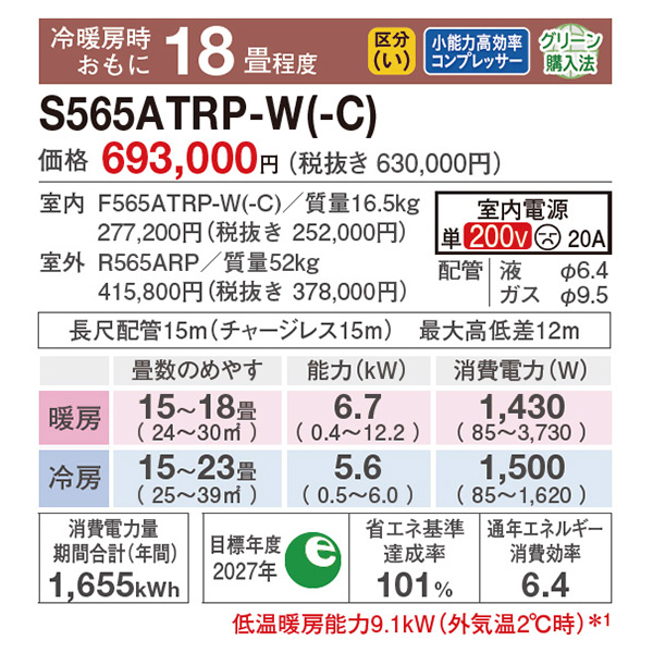 特記 東京ゼロエミポイント対象機種 カテゴリ ルームエアコン 型番 S565ATRP-CE 定価 645,000円 販売価格 税込 299,000円 送料 東京・神奈川全域:無料(一部地域や離島を除く) 詳細 ■メーカー:ダイキン ■モデル名:2025年モデル ■シリーズ名:うるさら RXシリーズ ■適用畳数:18畳用 ■カラー:ベージュ ■電源:単相200V ■室内機:F565ATRP-C ■室外機:R565ARP ●室内機サイズ:高さ295mm×幅798mm×奥行370mm ●室外機サイズ:高さ786mm×幅850(+89)mm×奥行320(+66)mm ■期間消費電力量(年間):1655kWh ■その他機能等 ・海浜地域仕様 / 耐塩害(室外機) ・うるる加湿(無給水加湿) ・さらら除湿 ・給気換気 / 排気換気 ・ストリーマ(空気清浄 / 内部クリーン) ・AI快適自動(換気制御) ・プレミアム冷房 ・フィルター自動お掃除 ・人 / 床温度センサー ※記載された情報は商品仕様の一部ですので、詳細はメーカーサイトにてご確認ください。 ※標準取付工事のほか、家電量販店では対応困難な『隠ぺい配管工事』も承ります。
