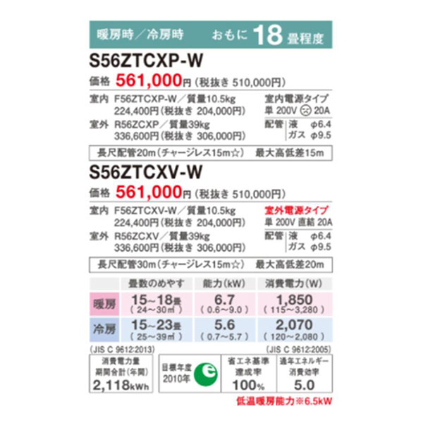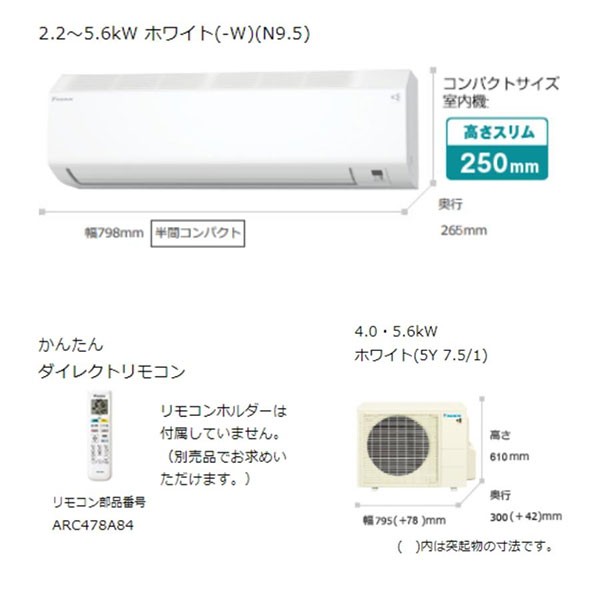 カテゴリ ルームエアコン 型番 S56ZTCXP-W 定価 510,000円 販売価格 税込 177,000円 送料 東京・神奈川全域:無料(一部地域や離島を除く) 詳細 ■メーカー:ダイキン ■モデル名:2022年モデル ■シリーズ名:CXシリーズ ■適用畳数:18畳用 ■カラー:ホワイト ■電源:単相200V ■室内機:F56ZTCXP-W ■室外機:R56ZCXP ●室内機サイズ:高250mm×幅798mm×奥行265mm ●室外機サイズ:高610mm×幅795(+78)mm×奥行300(+42)mm ■期間消費電力量(年間):2118kWh ■その他機能等 ・水内部クリーン ・フィルター自動お掃除 ・ストリーマ内部クリーン ・ストリーマ空気清浄 ・抗ウイルスフィルター ・スマホ接続対応(無線LAN接続アダプター別売) ・かんたんダイレクトリモコン(温度設定0.5℃単位) ・「高温防止」モード ・オートスイング ※記載された情報は商品仕様の一部ですので、詳細はメーカーサイトにてご確認ください。 ※標準取付工事のほか、家電量販店では対応困難な『隠ぺい配管工事』も承ります。