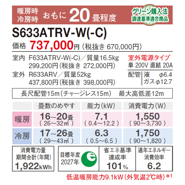 カテゴリ ルームエアコン 型番 S633ATRV-C 定価 670,000円 販売価格 税込 301,000円 送料 東京・神奈川全域:無料(一部地域や離島を除く) 詳細 ■メーカー:ダイキン ■モデル名:2023年モデル ■シリーズ名:うるさら RXシリーズ ■適用畳数:20畳用 ■カラー:ベージュ ■電源:単相200V ■室内機:F633ATRV-C ■室外機:R633ARV ●室内機サイズ:高さ295mm×幅798mm×奥行370mm ●室外機サイズ:高さ786mm×幅850(+74)mm×奥行320(+66)mm ■期間消費電力量(年間):1922kWh ■その他機能等 ・室外電源 ・プレミアム冷房 ・うるる加湿(無給水加湿) ・さらら除湿 ・AI快適自動運転 ・給気換気 / 排気換気 ・ストリーマ内部クリーン / ストリーマ空気清浄 ・人・床温度センサー(人・床・壁) ・フィルター自動お掃除 ※記載された情報は商品仕様の一部ですので、詳細はメーカーサイトにてご確認ください。 ※標準取付工事のほか、家電量販店では対応困難な『隠ぺい配管工事』も承ります。