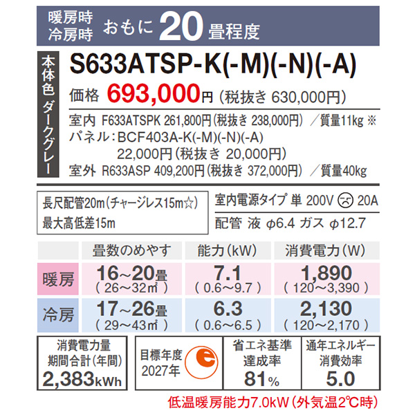 カテゴリ ルームエアコン 型番 S633ATSP-A 定価 630,000円 販売価格 税込 253,000円 送料 東京・神奈川全域:無料(一部地域や離島を除く) 詳細 ■メーカー:ダイキン ■モデル名:2023年モデル ■シリーズ名:risora SXシリーズ ■適用畳数:20畳用 ■カラー:ソライロ ■電源:単相200V ■室内機:F223ATSSW / パネル(BCF403A-A) ■室外機:R633ASP ●室内機サイズ:高295mm×幅798mm×奥行185mm ●室外機サイズ:高610mm×幅795(+78)mm×奥行300(+42)mm ■期間消費電力量(年間):2383kWh ■その他機能等 ・プレミアム冷房 ・PIT制御 ・タフネス冷房・暖房 ・さらら除湿 ・自動運転 ・垂直気流 ・風ないス運転 ・ロング気流 ・オートスイング ※記載された情報は商品仕様の一部ですので、詳細はメーカーサイトにてご確認ください。 ※標準取付工事のほか、家電量販店では対応困難な『隠ぺい配管工事』も承ります。