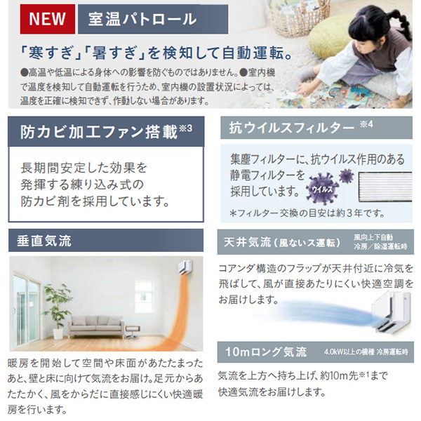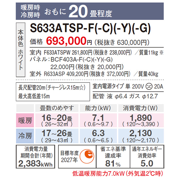 カテゴリ ルームエアコン 型番 S633ATSP-C 定価 630,000円 販売価格 税込 253,000円 送料 東京・神奈川全域:無料(一部地域や離島を除く) 詳細 ■メーカー:ダイキン ■モデル名:2023年モデル ■シリーズ名:risora SXシリーズ ■適用畳数:20畳用 ■カラー:ナチュラルウッド ■電源:単相200V ■室内機:F223ATSSW / パネル(BCF403A-C) ■室外機:R633ASP ●室内機サイズ:高295mm×幅798mm×奥行185mm ●室外機サイズ:高610mm×幅795(+78)mm×奥行300(+42)mm ■期間消費電力量(年間):2383kWh ■その他機能等 ・プレミアム冷房 ・PIT制御 ・タフネス冷房・暖房 ・さらら除湿 ・自動運転 ・垂直気流 ・風ないス運転 ・ロング気流 ・オートスイング ※記載された情報は商品仕様の一部ですので、詳細はメーカーサイトにてご確認ください。 ※標準取付工事のほか、家電量販店では対応困難な『隠ぺい配管工事』も承ります。