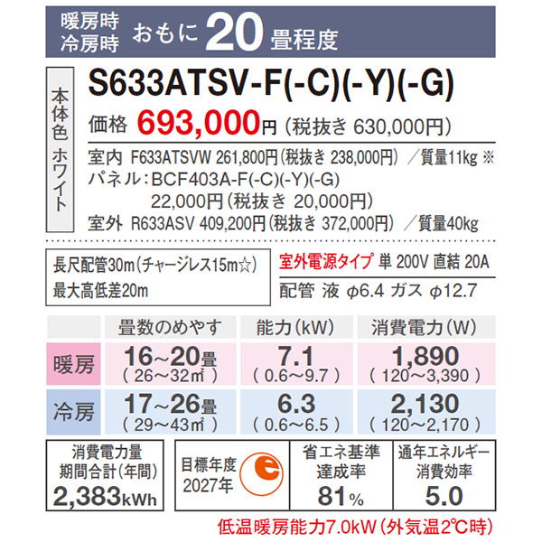カテゴリ ルームエアコン 型番 S633ATSV-Y 定価 630,000円 販売価格 税込 253,000円 送料 東京・神奈川全域:無料(一部地域や離島を除く) 詳細 ■メーカー:ダイキン ■モデル名:2023年モデル ■シリーズ名:risora SXシリーズ ■適用畳数:20畳用 ■カラー:ストーンベージュ ■電源:単相200V ■室内機:F223ATSSW / パネル(BCF403A-Y) ■室外機:R633ASV ●室内機サイズ:高295mm×幅798mm×奥行185mm ●室外機サイズ:高610mm×幅795(+78)mm×奥行300(+42)mm ■期間消費電力量(年間):2383kWh ■その他機能等 ・室外電源 ・プレミアム冷房 ・PIT制御 ・タフネス冷房・暖房 ・さらら除湿 ・自動運転 ・垂直気流 ・風ないス運転 ・ロング気流 ※記載された情報は商品仕様の一部ですので、詳細はメーカーサイトにてご確認ください。 ※標準取付工事のほか、家電量販店では対応困難な『隠ぺい配管工事』も承ります。