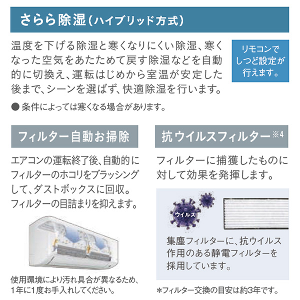 カテゴリ ルームエアコン 型番 S634ATGP-W 定価 650,000円 販売価格 税込 267,000円 送料 東京・神奈川全域:無料(一部地域や離島を除く) 詳細 ■メーカー:ダイキン ■モデル名:2024年モデル ■シリーズ名:GXシリーズ ■適用畳数:20畳用 ■カラー:ホワイト ■電源:単相200V ■室内機:F634ATGP-W ■室外機:R634AGP ●室内機サイズ:高さ295mm×幅798mm×奥行272mm ●室外機サイズ:高さ610mm×幅795(+78)mm×奥行300(+42)mm ■期間消費電力量(年間):2336kWh ■その他機能等 ・ストリーマ(空気清浄 / 内部クリーン) ・さらら除湿 ・プレミアム冷房 ・快適自動運転 ・フィルター自動お掃除 ・水内部クリーン(結露水洗浄) ・タフネス冷房・暖房 ・室温パトロール ・風ないス運転 ※記載された情報は商品仕様の一部ですので、詳細はメーカーサイトにてご確認ください。 ※標準取付工事のほか、家電量販店では対応困難な『隠ぺい配管工事』も承ります。