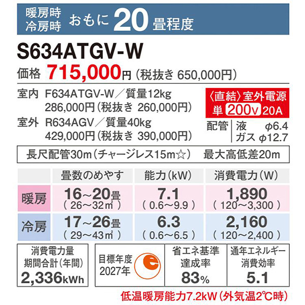 カテゴリ ルームエアコン 型番 S634ATGV-W 定価 650,000円 販売価格 税込 267,000円 送料 東京・神奈川全域:無料(一部地域や離島を除く) 詳細 ■メーカー:ダイキン ■モデル名:2024年モデル ■シリーズ名:GXシリーズ ■適用畳数:20畳用 ■カラー:ホワイト ■電源:単相200V ■室内機:F634ATGV-W ■室外機:R634AGV ●室内機サイズ:高さ295mm×幅798mm×奥行272mm ●室外機サイズ:高さ610mm×幅795(+78)mm×奥行300(+42)mm ■期間消費電力量(年間):2336kWh ■その他機能等 ・室外電源 ・ストリーマ(空気清浄 / 内部クリーン) ・さらら除湿 ・プレミアム冷房 ・快適自動運転 ・フィルター自動お掃除 ・水内部クリーン(結露水洗浄) ・タフネス冷房・暖房 ・室温パトロール ※記載された情報は商品仕様の一部ですので、詳細はメーカーサイトにてご確認ください。 ※標準取付工事のほか、家電量販店では対応困難な『隠ぺい配管工事』も承ります。