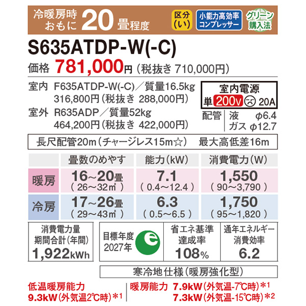 カテゴリ ルームエアコン 型番 S635ATDP-C 定価 710,000円 販売価格 税込 329,000円 送料 東京・神奈川全域:無料(一部地域や離島を除く) 詳細 ■メーカー:ダイキン ■モデル名:2025年モデル ■シリーズ名:スゴ暖 DXシリーズ ■適用畳数:20畳用 ■カラー:ベージュ ■電源:単相200V ■室内機:F635ATDP-C ■室外機:R635ADP ●室内機サイズ:高さ295mm×幅798mm×奥行370mm ●室外機サイズ:高さ729mm×幅850(+89)mm×奥行320(+72)mm ■期間消費電力量(年間):1922kWh ■その他機能等 ・寒冷地仕様 ・ストリーマ(空気清浄 / 内部クリーン) ・さらら除湿 ・プレミアム冷房 ・霜付き抑制熱交換器 ・AI快適自動運転 ・フィルター自動お掃除 ・人/床温度センサー ・室温パトロール ※記載された情報は商品仕様の一部ですので、詳細はメーカーサイトにてご確認ください。 ※標準取付工事のほか、家電量販店では対応困難な『隠ぺい配管工事』も承ります。