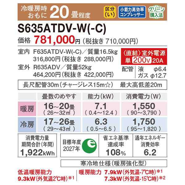カテゴリ ルームエアコン 型番 S635ATDV-CE2 定価 770,000円 販売価格 税込 357,000円 送料 東京・神奈川全域:無料(一部地域や離島を除く) 詳細 ■メーカー:ダイキン ■モデル名:2025年モデル ■シリーズ名:スゴ暖 DXシリーズ ■適用畳数:20畳用 ■カラー:ベージュ ■電源:単相200V ■室内機:F635ATDV-C ■室外機:R635ADV ●室内機サイズ:高さ295mm×幅798mm×奥行370mm ●室外機サイズ:高さ729mm×幅850(+89)mm×奥行320(+72)mm ■期間消費電力量(年間):1922kWh ■その他機能等 ・寒冷地仕様 ・海浜地域仕様 / 耐重塩害(室外機) ・室外電源 ・ストリーマ(空気清浄 / 内部クリーン) ・さらら除湿 ・プレミアム冷房 ・霜付き抑制熱交換器 ・AI快適自動運転 ・フィルター自動お掃除 ※記載された情報は商品仕様の一部ですので、詳細はメーカーサイトにてご確認ください。 ※標準取付工事のほか、家電量販店では対応困難な『隠ぺい配管工事』も承ります。