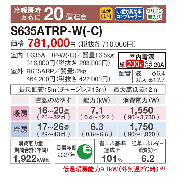 S635ATRP-CE ダイキン ルームエアコン うるるとさらら RXシリーズ 主に20畳 ベージュ 海浜地域仕様 耐塩害(室外機) 2025年モデル うるる加湿 さらら除湿