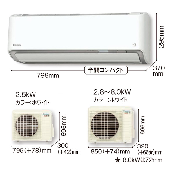 カテゴリ ルームエアコン 型番 S713ATDP-WE 定価 755,000円 販売価格 税込 379,000円 送料 東京・神奈川全域:無料(一部地域や離島を除く) 詳細 ■メーカー:ダイキン ■モデル名:2023年モデル ■シリーズ名:スゴ暖 DXシリーズ ■適用畳数:23畳用 ■カラー:ホワイト ■電源:単相200V ■室内機:F713ATDP-W ■室外機:R713ADP ●室内機サイズ:高さ295mm×幅798mm×奥行370mm ●室外機サイズ:高さ666mm×幅850(+74)mm×奥行320(+66)mm ■期間消費電力量(年間):2316kWh ■その他機能等 ・寒冷地仕様 ・海浜地域仕様 / 耐塩害(室外機) ・プレミアム冷房 ・さらら除湿 ・AI快適自動運転 ・垂直気流(暖房・冷房) ・ストリーマ(空気清浄 / 内部クリーン) ・高温風モード(60℃吹出し) ・10℃からの暖房設定 ※記載された情報は商品仕様の一部ですので、詳細はメーカーサイトにてご確認ください。 ※標準取付工事のほか、家電量販店では対応困難な『隠ぺい配管工事』も承ります。