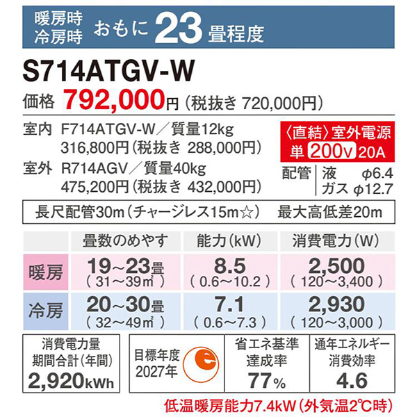 カテゴリ ルームエアコン 型番 S714ATGV-WE 定価 735,000円 販売価格 税込 318,000円 送料 東京・神奈川全域:無料(一部地域や離島を除く) 詳細 ■メーカー:ダイキン ■モデル名:2024年モデル ■シリーズ名:GXシリーズ ■適用畳数:23畳用 ■カラー:ホワイト ■電源:単相200V ■室内機:F714ATGV-W ■室外機:R714AGV ●室内機サイズ:高さ295mm×幅798mm×奥行272mm ●室外機サイズ:高さ610mm×幅795(+78)mm×奥行300(+42)mm ■期間消費電力量(年間):2920kWh ■その他機能等 ・海浜地域仕様 / 耐塩害(室外機) ・室外電源 ・ストリーマ(空気清浄 / 内部クリーン) ・さらら除湿 ・プレミアム冷房 ・快適自動運転 ・フィルター自動お掃除 ・水内部クリーン(結露水洗浄) ・タフネス冷房・暖房 ※記載された情報は商品仕様の一部ですので、詳細はメーカーサイトにてご確認ください。 ※標準取付工事のほか、家電量販店では対応困難な『隠ぺい配管工事』も承ります。