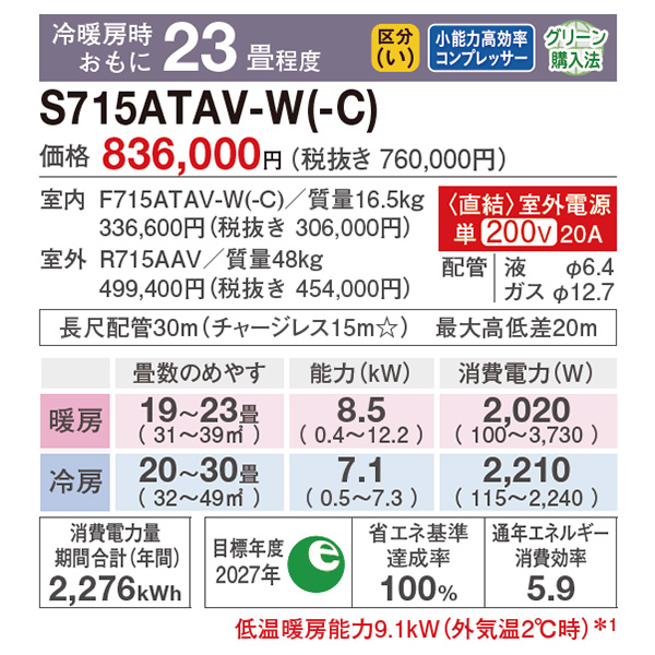 カテゴリ ルームエアコン 型番 S715ATAV-CE2 定価 820,000円 販売価格 税込 380,000円 送料 東京・神奈川全域:無料(一部地域や離島を除く) 詳細 ■メーカー:ダイキン ■モデル名:2025年モデル ■シリーズ名:AXシリーズ ■適用畳数:23畳用 ■カラー:ベージュ ■電源:単相200V ■室内機:F715ATAV-C ■室外機:R715AAV ●室内機サイズ:高さ295mm×幅798mm×奥行370mm ●室外機サイズ:高さ729mm×幅850(+89)mm×奥行320(+66)mm ■期間消費電力量(年間):2276kWh ■その他機能等 ・海浜地域仕様 / 耐重塩害(室外機) ・室外電源 ・ストリーマ(空気清浄 / 内部クリーン) ・さらら除湿 ・プレミアム冷房 ・人/床温度センサー ・AI快適自動運転 ・サーキュレーション気流 ・フィルター自動お掃除 ※記載された情報は商品仕様の一部ですので、詳細はメーカーサイトにてご確認ください。 ※標準取付工事のほか、家電量販店では対応困難な『隠ぺい配管工事』も承ります。