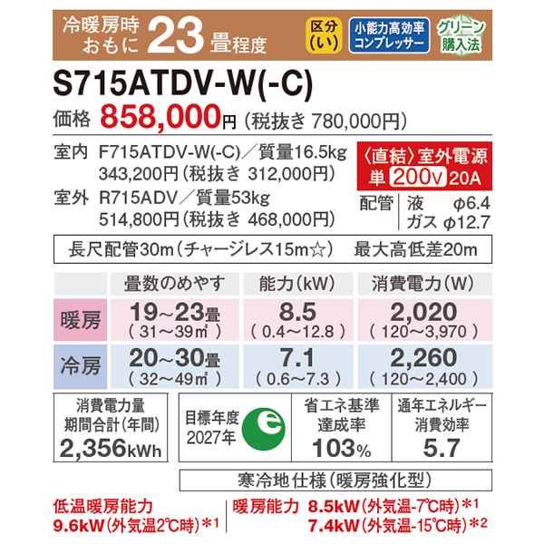 カテゴリ ルームエアコン 型番 S715ATDV-W 定価 780,000円 販売価格 税込 361,000円 送料 東京・神奈川全域:無料(一部地域や離島を除く) 詳細 ■メーカー:ダイキン ■モデル名:2025年モデル ■シリーズ名:スゴ暖 DXシリーズ ■適用畳数:23畳用 ■カラー:ホワイト ■電源:単相200V ■室内機:F715ATDV-W ■室外機:R715ADV ●室内機サイズ:高さ295mm×幅798mm×奥行370mm ●室外機サイズ:高さ729mm×幅850(+89)mm×奥行320(+72)mm ■期間消費電力量(年間):2356kWh ■その他機能等 ・寒冷地仕様 ・室外電源 ・ストリーマ(空気清浄 / 内部クリーン) ・さらら除湿 ・プレミアム冷房 ・霜付き抑制熱交換器 ・AI快適自動運転 ・フィルター自動お掃除 ・人/床温度センサー ※記載された情報は商品仕様の一部ですので、詳細はメーカーサイトにてご確認ください。 ※標準取付工事のほか、家電量販店では対応困難な『隠ぺい配管工事』も承ります。