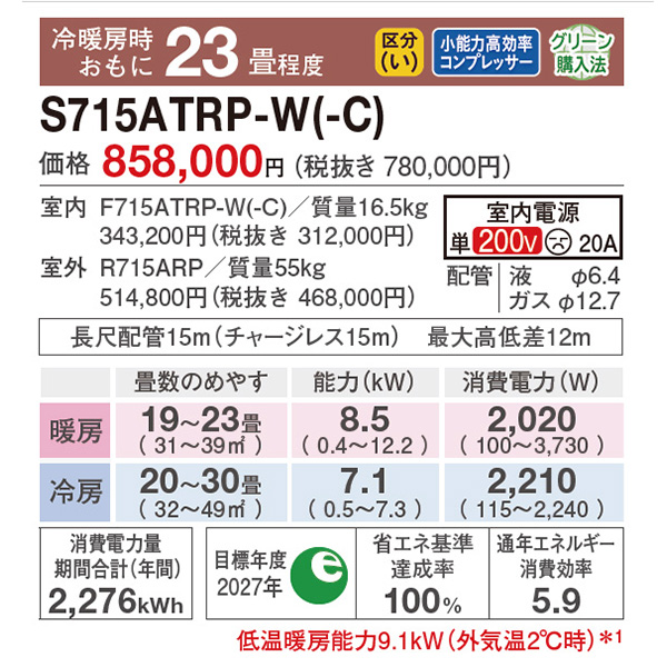 特記 東京ゼロエミポイント対象機種 カテゴリ ルームエアコン 型番 S715ATRP-CE 定価 795,000円 販売価格 税込 368,000円 送料 東京・神奈川全域:無料(一部地域や離島を除く) 詳細 ■メーカー:ダイキン ■モデル名:2025年モデル ■シリーズ名:うるさら RXシリーズ ■適用畳数:23畳用 ■カラー:ベージュ ■電源:単相200V ■室内機:F715ATRP-C ■室外機:R715ARP ●室内機サイズ:高さ295mm×幅798mm×奥行370mm ●室外機サイズ:高さ849mm×幅850(+89)mm×奥行320(+66)mm ■期間消費電力量(年間):2276kWh ■その他機能等 ・海浜地域仕様 / 耐塩害(室外機) ・うるる加湿(無給水加湿) ・さらら除湿 ・給気換気 / 排気換気 ・ストリーマ(空気清浄 / 内部クリーン) ・AI快適自動(換気制御) ・プレミアム冷房 ・フィルター自動お掃除 ・人 / 床温度センサー ※記載された情報は商品仕様の一部ですので、詳細はメーカーサイトにてご確認ください。 ※標準取付工事のほか、家電量販店では対応困難な『隠ぺい配管工事』も承ります。