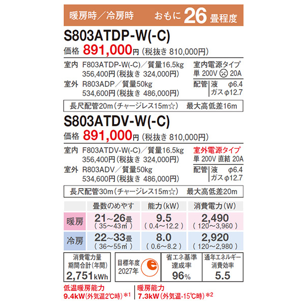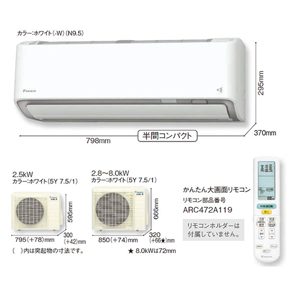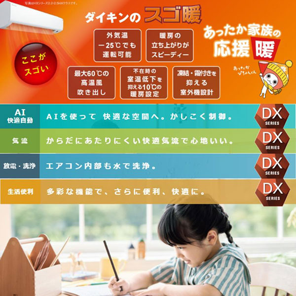 カテゴリ ルームエアコン 型番 S803ATDV-W 定価 オープン価格 販売価格 税込 375,000円 送料 東京・神奈川全域:無料(一部地域や離島を除く) 詳細 ■メーカー:ダイキン ■モデル名:2023年モデル ■シリーズ名:スゴ暖 DXシリーズ ■適用畳数:26畳用 ■カラー:ホワイト ■電源:単相200V ■室内機:F803ATDV-W ■室外機:R803ADV ●室内機サイズ:高さ295mm×幅798mm×奥行370mm ●室外機サイズ:高さ666mm×幅850(+74)mm×奥行320(+72)mm ■期間消費電力量(年間):2751kWh ■その他機能等 ・寒冷地仕様 ・室外電源 ・プレミアム冷房 ・さらら除湿 ・霜付き制御熱交換器 ・AI快適自動運転 ・ストリーマ空気清浄 / ストリーマ内部クリーン ・フィルター自動お掃除 ・高温風モード(60℃吹出し) ※記載された情報は商品仕様の一部ですので、詳細はメーカーサイトにてご確認ください。 ※標準取付工事のほか、家電量販店では対応困難な『隠ぺい配管工事』も承ります。
