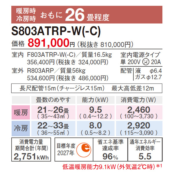 カテゴリ ルームエアコン 型番 S803ATRP-CE 定価 825,000円 販売価格 税込 395,000円 送料 東京・神奈川全域:無料(一部地域や離島を除く) 詳細 ■メーカー:ダイキン ■モデル名:2023年モデル ■シリーズ名:うるさら RXシリーズ ■適用畳数:26畳用 ■カラー:ベージュ ■電源:単相200V ■室内機:F803ATRP-C ■室外機:R803ARP ●室内機サイズ:高さ295mm×幅798mm×奥行370mm ●室外機サイズ:高さ786mm×幅850(+74)mm×奥行320(+72)mm ■期間消費電力量(年間):2316kWh ■その他機能等 ・海浜地域仕様 / 耐塩害(室外機) ・プレミアム冷房 ・うるる加湿(無給水加湿) ・さらら除湿 ・AI快適自動運転 ・給気換気 / 排気換気 ・ストリーマ内部クリーン / ストリーマ空気清浄 ・人・床温度センサー(人・床・壁) ・フィルター自動お掃除 ※記載された情報は商品仕様の一部ですので、詳細はメーカーサイトにてご確認ください。 ※標準取付工事のほか、家電量販店では対応困難な『隠ぺい配管工事』も承ります。