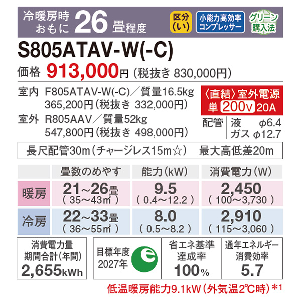 カテゴリ ルームエアコン 型番 S805ATAV-WE 定価 845,000円 販売価格 税込 391,000円 送料 東京・神奈川全域:無料(一部地域や離島を除く) 詳細 ■メーカー:ダイキン ■モデル名:2025年モデル ■シリーズ名:AXシリーズ ■適用畳数:26畳用 ■カラー:ホワイト ■電源:単相200V ■室内機:F805ATAV-W ■室外機:R805AAV ●室内機サイズ:高さ295mm×幅798mm×奥行370mm ●室外機サイズ:高さ729mm×幅850(+89)mm×奥行320(+72)mm ■期間消費電力量(年間):2655kWh ■その他機能等 ・海浜地域仕様 / 耐塩害(室外機) ・室外電源 ・ストリーマ(空気清浄 / 内部クリーン) ・さらら除湿 ・プレミアム冷房 ・人/床温度センサー ・AI快適自動運転 ・サーキュレーション気流 ・フィルター自動お掃除 ※記載された情報は商品仕様の一部ですので、詳細はメーカーサイトにてご確認ください。 ※標準取付工事のほか、家電量販店では対応困難な『隠ぺい配管工事』も承ります。