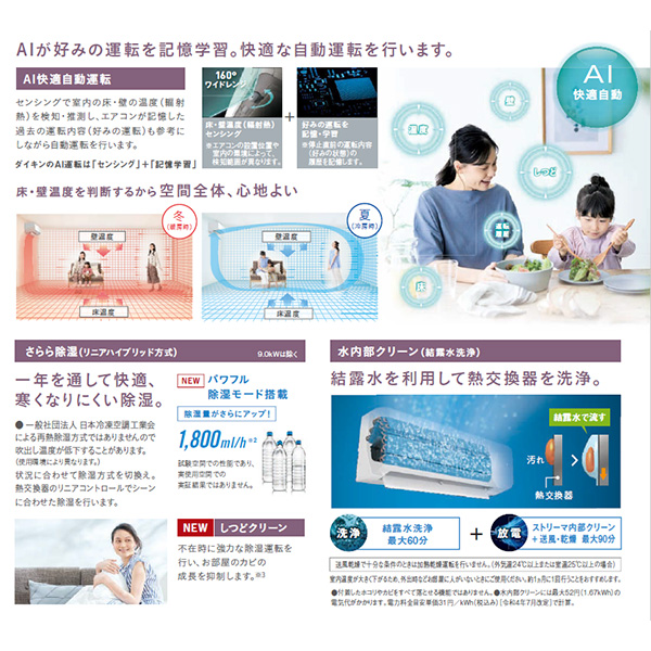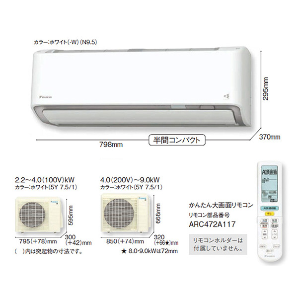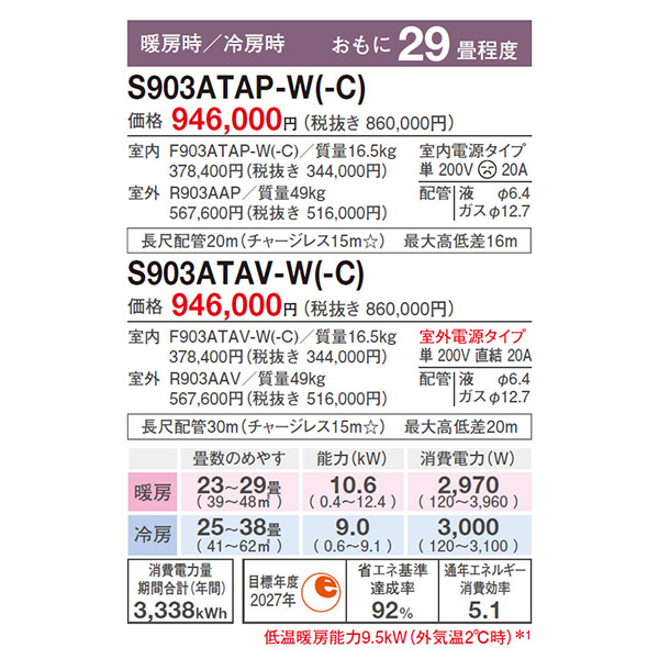 カテゴリ ルームエアコン 型番 S903ATAP-W 定価 オープン価格 販売価格 税込 398,000円 送料 東京・神奈川全域:無料(一部地域や離島を除く) 詳細 ■メーカー:ダイキン ■モデル名:2023年モデル ■シリーズ名:AXシリーズ ■適用畳数:29畳用 ■カラー:ホワイト ■電源:単相200V ■室内機:F903ATAP-W ■室外機:R903AAP ●室内機サイズ:高さ295mm×幅798mm×奥行370mm ●室外機サイズ:高さ666mm×幅850(+74)mm×奥行300(+72)mm ■期間消費電力量(年間):3338kWh ■その他機能等 ・プレミアム冷房 ・さらら除湿 ・AI快適自動運転 ・垂直気流(暖房・冷房) ・人・床温度センサー(人・床・壁) ・ストリーマ内部クリーン / ストリーマ空気清浄 ・高温風モード(60℃吹出し) ・フィルター自動お掃除 ・室温パトロール ※記載された情報は商品仕様の一部ですので、詳細はメーカーサイトにてご確認ください。 ※標準取付工事のほか、家電量販店では対応困難な『隠ぺい配管工事』も承ります。