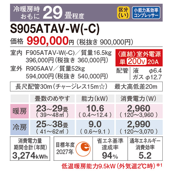 カテゴリ ルームエアコン 型番 S905ATAV-CE 定価 915,000円 販売価格 税込 424,000円 送料 東京・神奈川全域:無料(一部地域や離島を除く) 詳細 ■メーカー:ダイキン ■モデル名:2025年モデル ■シリーズ名:AXシリーズ ■適用畳数:29畳用 ■カラー:ベージュ ■電源:単相200V ■室内機:F905ATAV-C ■室外機:R905AAV ●室内機サイズ:高さ295mm×幅798mm×奥行370mm ●室外機サイズ:高さ729mm×幅850(+89)mm×奥行320(+72)mm ■期間消費電力量(年間):3274kWh ■その他機能等 ・海浜地域仕様 / 耐塩害(室外機) ・室外電源 ・ストリーマ(空気清浄 / 内部クリーン) ・プレミアム冷房 ・人/床温度センサー ・AI快適自動運転 ・サーキュレーション気流 ・フィルター自動お掃除 ・水内部クリーン(結露水洗浄) ※記載された情報は商品仕様の一部ですので、詳細はメーカーサイトにてご確認ください。 ※標準取付工事のほか、家電量販店では対応困難な『隠ぺい配管工事』も承ります。