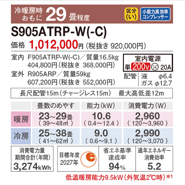 特記 東京ゼロエミポイント対象機種 カテゴリ ルームエアコン 型番 S905ATRP-W 定価 920,000円 販売価格 税込 426,000円 送料 東京・神奈川全域:無料(一部地域や離島を除く) 詳細 ■メーカー:ダイキン ■モデル名:2025年モデル ■シリーズ名:うるさら RXシリーズ ■適用畳数:29畳用 ■カラー:ホワイト ■電源:単相200V ■室内機:F905ATRP-W ■室外機:R905ARP ●室内機サイズ:高さ295mm×幅798mm×奥行370mm ●室外機サイズ:高さ849mm×幅850(+89)mm×奥行320(+72)mm ■期間消費電力量(年間):3274kWh ■その他機能等 ・うるる加湿(無給水加湿) ・さらら除湿 ・給気換気 / 排気換気 ・ストリーマ(空気清浄 / 内部クリーン) ・AI快適自動(換気制御) ・プレミアム冷房 ・フィルター自動お掃除 ・人 / 床温度センサー ・水内部クリーン(結露水洗浄) ※記載された情報は商品仕様の一部ですので、詳細はメーカーサイトにてご確認ください。 ※標準取付工事のほか、家電量販店では対応困難な『隠ぺい配管工事』も承ります。