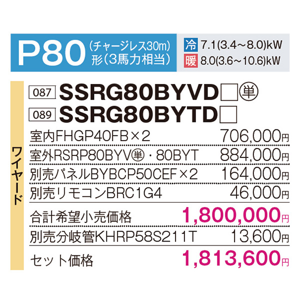 カテゴリ 業務用エアコン 型番 SSRG80BYVD / SSRG80BYTD 定価 1,994,960円 販売価格 税込 588,000円 送料 東京・神奈川全域:無料(一部地域や離島を除く) 詳細 ■メーカー:ダイキン ■モデル名:2023年モデル ■タイプ名:パッケージエアコン / 天井埋込形2方向 / FIVE STAR ZEAS / エコ・ダブルフロー / センシングタイプ / ツイン(室内機2台×室外機1台) ■能力:3馬力(P80形) /【平米数】47~70㎡ /【坪数】14~21坪 /【畳数】28~42畳 ■電源:単相200V / 三相200V ■室内機:FHGP40FB x2 ■室外機:RSRP80BYV / RSRP80BYT ●室内機サイズ:高さ350mm×幅775mm×奥行620mm ●室外機サイズ:高さ990mm×幅940mm×奥行320mm ■通年エネルギー消費効率:5.3 ■その他機能等 ・ワイヤード ・スマート学習節電 ・Eco全自動運転 ・フォーシーズン制御 ・快適エコ除湿制御 ・快速冷暖モード ・ホットスタート(除霜後) ・水内部クリーン ・抗菌・防カビフィルター ※記載された情報は商品仕様の一部ですので、詳細はメーカーサイトにてご確認ください。 ※標準取付工事のほか、家電量販店では対応困難な『隠ぺい配管工事』も承ります。