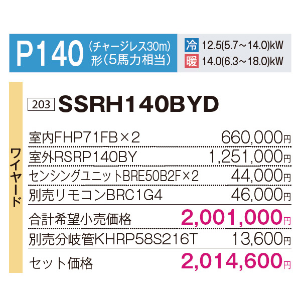 カテゴリ 業務用エアコン 型番 SSRH140BYD 定価 2,216,060円 販売価格 税込 653,000円 送料 東京・神奈川全域:無料(一部地域や離島を除く) 詳細 ■メーカー:ダイキン ■モデル名:2023年モデル ■タイプ名:パッケージエアコン / 天井吊り形1方向 / FIVE STAR ZEAS / センシングタイプ / ツイン(室内機2台×室外機1台) ■能力:5馬力(P140形) /【平米数】82~122㎡ /【坪数】24~36坪 /【畳数】48~72畳 ■電源:三相200V ■室内機:FHP71FB ×2 ■室外機:RSRP140BY ●室内機サイズ:235mm×1270mm×690mm ●室外機サイズ:1430mm×940mm×320mm ■その他機能等 ・ワイヤード ・スマート学習節電 ・Eco全自動運転 ・フォーシーズン制御 ・快適エコ除湿制御 ・快速冷暖モード ・ホットスタート(除霜後) ・水内部クリーン ・抗菌・防カビフィルター ※記載された情報は商品仕様の一部ですので、詳細はメーカーサイトにてご確認ください。 ※標準取付工事のほか、家電量販店では対応困難な『隠ぺい配管工事』も承ります。