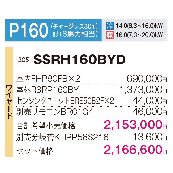 カテゴリ 業務用エアコン 型番 SSRH160BYD 定価 2,383,260円 販売価格 税込 701,000円 送料 東京・神奈川全域:無料(一部地域や離島を除く) 詳細 ■メーカー:ダイキン ■モデル名:2023年モデル ■タイプ名:パッケージエアコン / 天井吊り形1方向 / FIVE STAR ZEAS / センシングタイプ / ツイン(室内機2台×室外機1台) ■能力:6馬力(P160形) /【平米数】94~139㎡ /【坪数】28~42坪 /【畳数】56~84畳 ■電源:三相200V ■室内機:FHP80FB ×2 ■室外機:RSRP160BY ●室内機サイズ:235mm×1270mm×690mm ●室外機サイズ:1430mm×940mm×320mm ■その他機能等 ・ワイヤード ・スマート学習節電 ・Eco全自動運転 ・フォーシーズン制御 ・快適エコ除湿制御 ・快速冷暖モード ・ホットスタート(除霜後) ・水内部クリーン ・抗菌・防カビフィルター ※記載された情報は商品仕様の一部ですので、詳細はメーカーサイトにてご確認ください。 ※標準取付工事のほか、家電量販店では対応困難な『隠ぺい配管工事』も承ります。