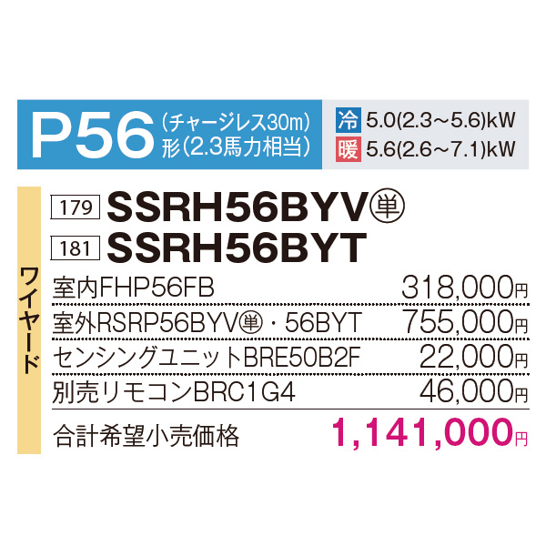カテゴリ 業務用エアコン 型番 SSRH56BYV / SSRH56BYT 定価 1,255,100円 販売価格 税込 370,000円 送料 東京・神奈川全域:無料(一部地域や離島を除く) 詳細 ■メーカー:ダイキン ■モデル名:2023年モデル ■タイプ名:パッケージエアコン / 天井吊り形1方向 / FIVE STAR ZEAS / センシングタイプ / シングル(室内機1台×室外機1台) ■能力:2.3馬力(P56形) /【平米数】33~49㎡ /【坪数】10~14坪 /【畳数】20~28畳 ■電源:単相200V / 三相200V ■室内機:FHP56FB ■室外機:RSRP56BYV / RSRP56BYT ●室内機サイズ:235mm×960mm×690mm ●室外機サイズ:610mm×795mm×300mm ■その他機能等 ・ワイヤード ・スマート学習節電 ・Eco全自動運転 ・フォーシーズン制御 ・快適エコ除湿制御 ・快速冷暖モード ・ホットスタート(除霜後) ・水内部クリーン ・抗菌・防カビフィルター ※記載された情報は商品仕様の一部ですので、詳細はメーカーサイトにてご確認ください。 ※標準取付工事のほか、家電量販店では対応困難な『隠ぺい配管工事』も承ります。