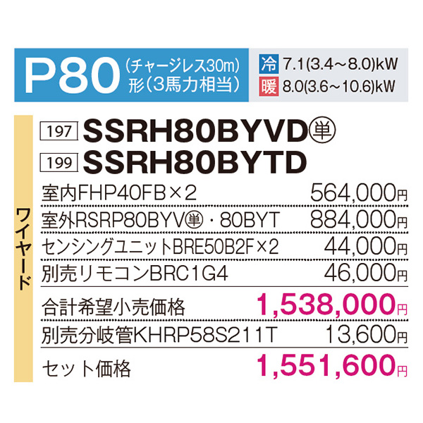 カテゴリ 業務用エアコン 型番 SSRH80BYVD / SSRH80BYTD 定価 1,706,760円 販売価格 税込 503,000円 送料 東京・神奈川全域:無料(一部地域や離島を除く) 詳細 ■メーカー:ダイキン ■モデル名:2023年モデル ■タイプ名:パッケージエアコン / 天井吊り形1方向 / FIVE STAR ZEAS / センシングタイプ / ツイン(室内機2台×室外機1台) ■能力:3馬力(P80形) /【平米数】47~70㎡ /【坪数】14~21坪 /【畳数】28~42畳 ■電源:単相200V / 三相200V ■室内機:FHP40FB ×2 ■室外機:RSRP80BYV / RSRP80BYT ●室内機サイズ:235mm×960mm×690mm ●室外機サイズ:990mm×940mm×320mm ■その他機能等 ・ワイヤード ・スマート学習節電 ・Eco全自動運転 ・フォーシーズン制御 ・快適エコ除湿制御 ・快速冷暖モード ・ホットスタート(除霜後) ・水内部クリーン ・抗菌・防カビフィルター ※記載された情報は商品仕様の一部ですので、詳細はメーカーサイトにてご確認ください。 ※標準取付工事のほか、家電量販店では対応困難な『隠ぺい配管工事』も承ります。