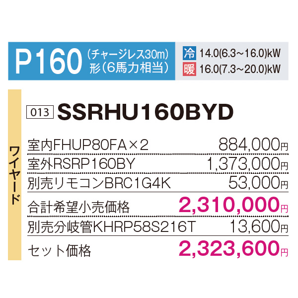 カテゴリ 業務用エアコン 型番 SSRHU160BYD 定価 2,555,960円 販売価格 税込 753,000円 送料 東京・神奈川全域:無料(一部地域や離島を除く) 詳細 ■メーカー:ダイキン ■モデル名:2023年モデル ■タイプ名:パッケージエアコン / 天井吊り形1方向 / スタイリッシュフロー / FIVE STAR ZEAS / ツイン(室内機2台×室外機1台) ■能力:6馬力(P160形) /【平米数】94~139㎡ /【坪数】28~42坪 /【畳数】56~84畳 ■カラー:ブラック ■電源:三相200V ■室内機:FHUP80FA x2 ■室外機:RSRP160BY ●室内機サイズ:高さ210mm×幅1380mm×奥行630mm ●室外機サイズ:高さ1430mm×幅940mm×奥行320mm ■その他機能等 ・ワイヤード ・スマート学習節電 ・フォーシーズン制御 ・風量エコ自動制御 ・快速冷暖モード ・余熱再利用運転 ・2セレクトサーモ ・ホットスタート(除霜後) ・抗菌・防カビフィルター ※記載された情報は商品仕様の一部ですので、詳細はメーカーサイトにてご確認ください。 ※標準取付工事のほか、家電量販店では対応困難な『隠ぺい配管工事』も承ります。