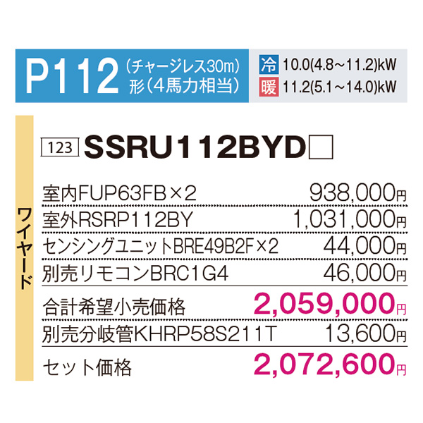 カテゴリ 業務用エアコン 型番 SSRU112BYD 定価 2,279,860円 販売価格 税込 671,000円 送料 東京・神奈川全域:無料(一部地域や離島を除く) 詳細 ■メーカー:ダイキン ■モデル名:2023年モデル ■タイプ名:パッケージエアコン / 天井吊り形4方向 / FIVE STAR ZEAS / ワンダ風流 / センシングタイプ / ツイン(室内機2台×室外機1台) ■能力:4馬力(P112形) /【平米数】66~97㎡ /【坪数】20~29坪 /【畳数】40~58畳 ■電源:三相200V ■室内機:FUP63FB x2 ■室外機:RSRP112BY ●室内機サイズ:高さ198mm×幅950mm×奥行950mm ●室外機サイズ:高さ1430mm×幅940mm×奥行320mm ■通年エネルギー消費効率:5.7 ■その他機能等 ・ワイヤード ・Eco全自動運転 ・床温エコ検知 ・フォーシーズン制御 ・快適エコ除湿制御 ・快速冷暖モード ・ホットスタート(除霜後) ・水内部クリーン ・抗菌・防カビフィルター ※記載された情報は商品仕様の一部ですので、詳細はメーカーサイトにてご確認ください。 ※標準取付工事のほか、家電量販店では対応困難な『隠ぺい配管工事』も承ります。