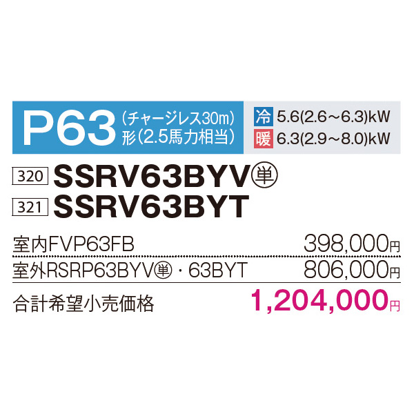 カテゴリ 業務用エアコン 型番 SSRV63BYV / SSRV63BYT 定価 1,324,400円 販売価格 税込 390,000円 送料 東京・神奈川全域:無料(一部地域や離島を除く) 詳細 ■メーカー:ダイキン ■モデル名:2023年モデル ■タイプ名:パッケージエアコン / 床置き形 / FIVE STAR ZEAS / シングル(室内機1台×室外機1台) ■能力:2.5馬力(P63形) /【平米数】37~55㎡ /【坪数】11~16坪 /【畳数】22~32畳 ■電源:単相200V / 三相200V ■室内機:FVP63FB ■室外機:RSRP63BYV / RSRP63BYT ●室内機サイズ:高さ1850mm×幅600mm×奥行270mm ●室外機サイズ:高さ610mm×幅795mm×奥行300mm ■その他機能等 ・ワイヤード ・スマート学習節電 ・フォーシーズン制御 ・風量エコ自動制御 ・快速冷暖モード ・余熱再利用運転 ・マイコンドライ ・ホットスタート(除霜後) ・抗菌・防カビフィルター ※記載された情報は商品仕様の一部ですので、詳細はメーカーサイトにてご確認ください。 ※標準取付工事のほか、家電量販店では対応困難な『隠ぺい配管工事』も承ります。