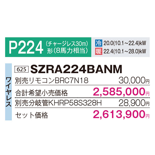 カテゴリ 業務用エアコン 型番 SZRA224BANM 定価 2,875,290円 販売価格 税込 706,000円 送料 東京・神奈川全域:無料(一部地域や離島を除く) 詳細 ■メーカー:ダイキン ■モデル名:2023年モデル ■タイプ名:パッケージエアコン / 壁掛け形 / Eco ZEAS / 標準タイプ / トリプル(室内機3台×室外機1台) ■能力:8馬力(P224形) /【平米数】132~195㎡ /【坪数】40~59坪 /【畳数】80~118畳 ■電源:三相200V ■室内機:FAP80FB ×3 ■室外機:RZRP224BA ●室内機サイズ:高さ290mm×幅1050mm×奥行238mm ●室外機サイズ:高さ1430mm×幅940mm×奥行320mm ■その他機能等 ・ワイヤレス ・スマート学習節電 ・風量エコ自動制御 ・フォーシーズン制御 ・高温みまもり運転 ・快速冷暖モード ・オートスイング ・ホットスタート(除霜後) ・抗菌・防カビフィルター ※記載された情報は商品仕様の一部ですので、詳細はメーカーサイトにてご確認ください。 ※標準取付工事のほか、家電量販店では対応困難な『隠ぺい配管工事』も承ります。
