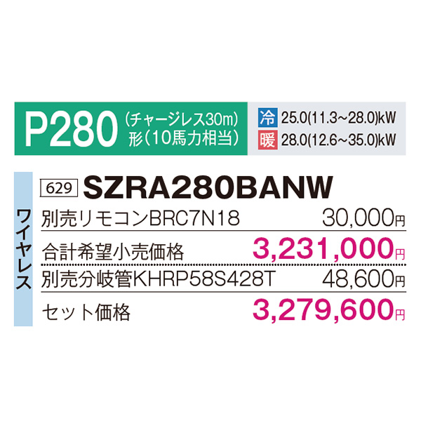 カテゴリ 業務用エアコン 型番 SZRA280BANW 定価 3,607,560円 販売価格 税込 885,000円 送料 東京・神奈川全域:無料(一部地域や離島を除く) 詳細 ■メーカー:ダイキン ■モデル名:2023年モデル ■タイプ名:パッケージエアコン / 壁掛け形 / Eco ZEAS / 標準タイプ / ダブルツイン(室内機4台×室外機1台) ■能力:10馬力(P280形) /【平米数】165~243㎡ /【坪数】50~73坪 /【畳数】100~146畳 ■電源:三相200V ■室内機:FAP71FB ×4 ■室外機:RZRP280BA ●室内機サイズ:高さ290mm×幅1050mm×奥行238mm ●室外機サイズ:高さ1430mm×幅940mm×奥行320mm ■その他機能等 ・ワイヤレス ・スマート学習節電 ・風量エコ自動制御 ・フォーシーズン制御 ・高温みまもり運転 ・快速冷暖モード ・オートスイング ・ホットスタート(除霜後) ・抗菌・防カビフィルター ※記載された情報は商品仕様の一部ですので、詳細はメーカーサイトにてご確認ください。 ※標準取付工事のほか、家電量販店では対応困難な『隠ぺい配管工事』も承ります。