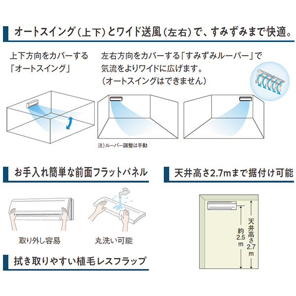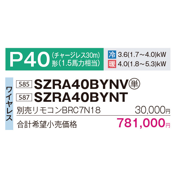 カテゴリ 業務用エアコン 型番 SZRA40BYNV / SZRA40BYNT 定価 859,100円 販売価格 税込 212,000円 送料 東京・神奈川全域:無料(一部地域や離島を除く) 詳細 ■メーカー:ダイキン ■モデル名:2023年モデル ■タイプ名:パッケージエアコン / 壁掛け形 / Eco ZEAS / 標準タイプ / シングル(室内機1台×室外機1台) ■能力:1.5馬力(P40形) /【平米数】24~35㎡ /【坪数】7~10坪 /【畳数】14~20畳 ■電源:単相200V / 三相200V ■室内機:FAP40FB ■室外機:RZRP40BYV / RZRP40BYT ●室内機サイズ:高さ290mm×幅795mm×奥行238mm ●室外機サイズ:高さ610mm×幅795mm×奥行300mm ■その他機能等 ・ワイヤレス ・スマート学習節電 ・風量エコ自動制御 ・フォーシーズン制御 ・高温みまもり運転 ・快速冷暖モード ・オートスイング ・ホットスタート(除霜後) ・抗菌・防カビフィルター ※記載された情報は商品仕様の一部ですので、詳細はメーカーサイトにてご確認ください。 ※標準取付工事のほか、家電量販店では対応困難な『隠ぺい配管工事』も承ります。