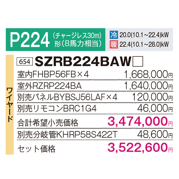 カテゴリ 業務用エアコン 型番 SZRB224BAW 定価 3,874,860円 販売価格 税込 951,000円 送料 東京・神奈川全域:無料(一部地域や離島を除く) 詳細 ■メーカー:ダイキン ■モデル名:2023年モデル ■タイプ名:パッケージエアコン / ビルトインHi / Eco ZEAS / ダブルツイン(室内機4台×室外機1台) ■能力:8馬力(P224形) /【平米数】132~195㎡ /【坪数】40~59坪 /【畳数】80~118畳 ■電源:三相200V ■室内機:FHBP56FB ×4 ■室外機:RZRP224BA ●室内機サイズ:高さ272mm×幅700mm×奥行800mm ●室外機サイズ:高さ1430mm×幅940mm×奥行320mm ■その他機能等 ・ワイヤード ・スマート学習節電 ・風量エコ自動制御 ・フォーシーズン制御 ・高温みまもり運転 ・快速冷暖モード ・マイコンドライ ・ホットスタート(除霜後) ・抗菌・防カビフィルター ※記載された情報は商品仕様の一部ですので、詳細はメーカーサイトにてご確認ください。 ※標準取付工事のほか、家電量販店では対応困難な『隠ぺい配管工事』も承ります。