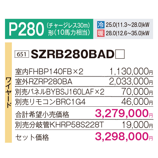 カテゴリ 業務用エアコン 型番 SZRB280BAD 定価 3,627,800円 販売価格 税込 890,000円 送料 東京・神奈川全域:無料(一部地域や離島を除く) 詳細 ■メーカー:ダイキン ■モデル名:2023年モデル ■タイプ名:パッケージエアコン / ビルトインHi / Eco ZEAS / ツイン(室内機2台×室外機1台) ■能力:10馬力(P280形) /【平米数】165~243㎡ /【坪数】50~73坪 /【畳数】100~146畳 ■電源:三相200V ■室内機:FHBP140FB ×2 ■室外機:RZRP280BA ●室内機サイズ:高さ272mm×幅1400mm×奥行800mm ●室外機サイズ:高さ1430mm×幅940mm×奥行320mm ■その他機能等 ・ワイヤード ・スマート学習節電 ・風量エコ自動制御 ・フォーシーズン制御 ・高温みまもり運転 ・快速冷暖モード ・マイコンドライ ・ホットスタート(除霜後) ・抗菌・防カビフィルター ※記載された情報は商品仕様の一部ですので、詳細はメーカーサイトにてご確認ください。 ※標準取付工事のほか、家電量販店では対応困難な『隠ぺい配管工事』も承ります。