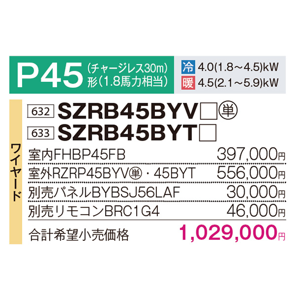 カテゴリ 業務用エアコン 型番 SZRB45BYV / SZRB45BYT 定価 1,131,900円 販売価格 税込 279,000円 送料 東京・神奈川全域:無料(一部地域や離島を除く) 詳細 ■メーカー:ダイキン ■モデル名:2023年モデル ■タイプ名:パッケージエアコン / ビルトインHi / Eco ZEAS / シングル(室内機1台×室外機1台) ■能力:1.8馬力(P45形) /【平米数】26~39㎡ /【坪数】7~11坪 /【畳数】14~22畳 ■電源:単相200V / 三相200V ■室内機:FHBP45FB ■室外機:RZRP45BYV / RZRP45BYT ●室内機サイズ:高さ272mm×幅700mm×奥行800mm ●室外機サイズ:高さ610mm×幅795mm×奥行300mm ■その他機能等 ・ワイヤード ・スマート学習節電 ・風量エコ自動制御 ・フォーシーズン制御 ・高温みまもり運転 ・快速冷暖モード ・マイコンドライ ・ホットスタート(除霜後) ・抗菌・防カビフィルター ※記載された情報は商品仕様の一部ですので、詳細はメーカーサイトにてご確認ください。 ※標準取付工事のほか、家電量販店では対応困難な『隠ぺい配管工事』も承ります。
