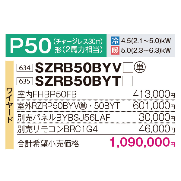 カテゴリ 業務用エアコン 型番 SZRB50BYV / SZRB50BYT 定価 1,199,000円 販売価格 税込 295,000円 送料 東京・神奈川全域:無料(一部地域や離島を除く) 詳細 ■メーカー:ダイキン ■モデル名:2023年モデル ■タイプ名:パッケージエアコン / ビルトインHi / Eco ZEAS / シングル(室内機1台×室外機1台) ■能力:2馬力(P50形) /【平米数】29~43㎡ /【坪数】8~13坪 /【畳数】16~26畳 ■電源:単相200V / 三相200V ■室内機:FHBP50FB ■室外機:RZRP50BYV / RZRP50BYT ●室内機サイズ:高さ272mm×幅700mm×奥行800mm ●室外機サイズ:高さ610mm×幅795mm×奥行300mm ■その他機能等 ・ワイヤード ・スマート学習節電 ・風量エコ自動制御 ・フォーシーズン制御 ・高温みまもり運転 ・快速冷暖モード ・マイコンドライ ・ホットスタート(除霜後) ・抗菌・防カビフィルター ※記載された情報は商品仕様の一部ですので、詳細はメーカーサイトにてご確認ください。 ※標準取付工事のほか、家電量販店では対応困難な『隠ぺい配管工事』も承ります。
