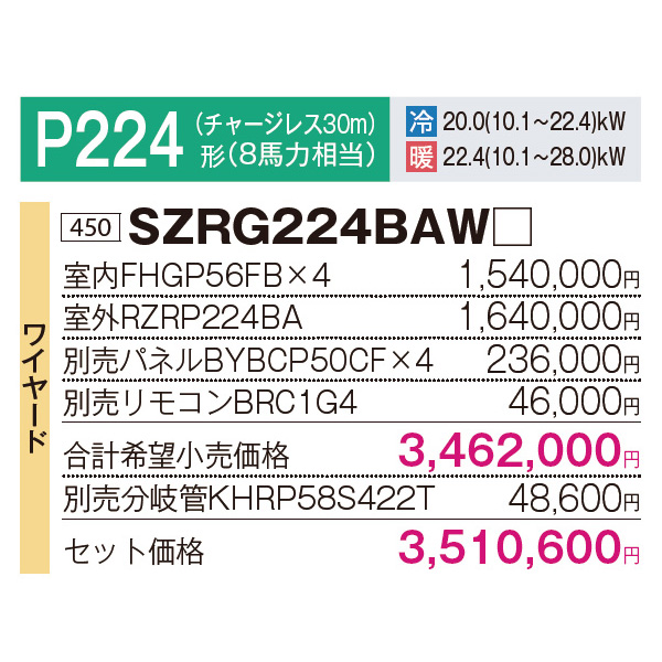 カテゴリ 業務用エアコン 型番 SZRG224BAW 定価 3,861,660円 販売価格 税込 948,000円 送料 東京・神奈川全域:無料(一部地域や離島を除く) 詳細 ■メーカー:ダイキン ■モデル名:2023年モデル ■タイプ名:パッケージエアコン / 天井埋込形2方向 / Eco ZEAS / エコ・ダブルフロー / 標準タイプ / ダブルツイン(室内機4台×室外機1台) ■能力:8馬力(P224形) /【平米数】132~195㎡ /【坪数】40~59坪 /【畳数】80~118畳 ■電源:三相200V ■室内機:FHGP56FB x4 ■室外機:RZRP224BA ●室内機サイズ:高さ350mm×幅775mm×奥行620mm ●室外機サイズ:高さ1430mm×幅940mm×奥行320mm ■通年エネルギー消費効率:4.9 ■その他機能等 ・ワイヤード ・スマート学習節電 ・除湿冷房 ・フォーシーズン制御 ・快適エコ除湿制御 ・快速冷暖モード ・ホットスタート(除霜後) ・水内部クリーン ・抗菌・防カビフィルター ※記載された情報は商品仕様の一部ですので、詳細はメーカーサイトにてご確認ください。 ※標準取付工事のほか、家電量販店では対応困難な『隠ぺい配管工事』も承ります。
