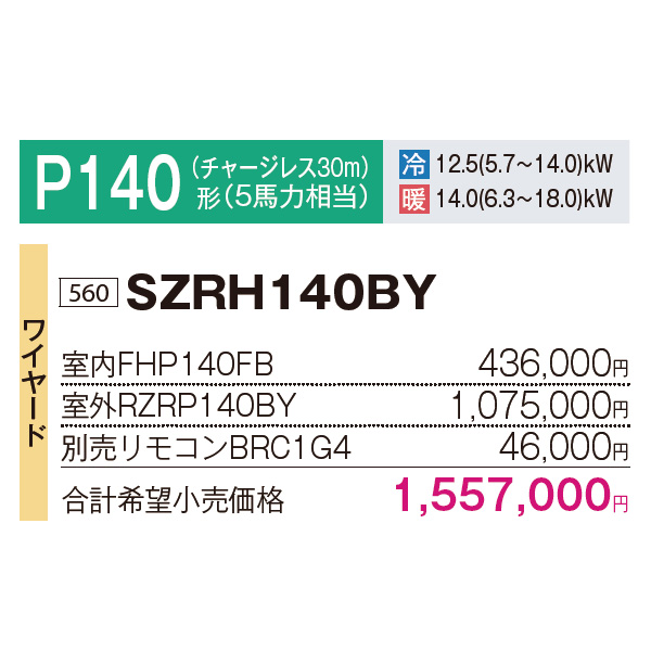 カテゴリ 業務用エアコン 型番 SZRH140BY 定価 1,712,700円 販売価格 税込 421,000円 送料 東京・神奈川全域:無料(一部地域や離島を除く) 詳細 ■メーカー:ダイキン ■モデル名:2023年モデル ■タイプ名:パッケージエアコン / 天井吊り形1方向 / Eco ZEAS / 標準タイプ / シングル(室内機1台×室外機1台) ■能力:5馬力(P140形) /【平米数】82~122㎡ /【坪数】24~36坪 /【畳数】48~72畳 ■電源:三相200V ■室内機:FHP140FB ■室外機:RZRP140BY ●室内機サイズ:235mm×1590mm×690mm ●室外機サイズ:1080mm×940mm×320mm ■その他機能等 ・ワイヤード ・スマート学習節電 ・除湿冷房 ・フォーシーズン制御 ・快適エコ除湿制御 ・快速冷暖モード ・ホットスタート(除霜後) ・水内部クリーン ・抗菌・防カビフィルター ※記載された情報は商品仕様の一部ですので、詳細はメーカーサイトにてご確認ください。 ※標準取付工事のほか、家電量販店では対応困難な『隠ぺい配管工事』も承ります。