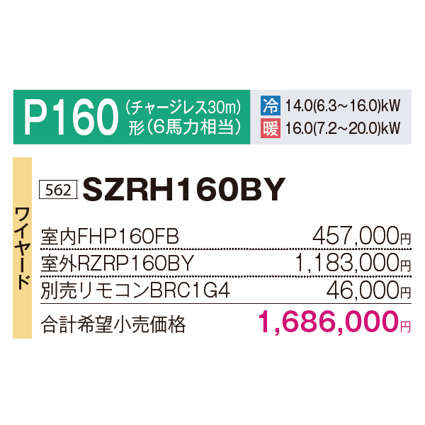 カテゴリ 業務用エアコン 型番 SZRH160BY 定価 1,854,600円 販売価格 税込 456,000円 送料 東京・神奈川全域:無料(一部地域や離島を除く) 詳細 ■メーカー:ダイキン ■モデル名:2023年モデル ■タイプ名:パッケージエアコン / 天井吊り形1方向 / Eco ZEAS / 標準タイプ / シングル(室内機1台×室外機1台) ■能力:6馬力(P160形) /【平米数】94~139㎡ /【坪数】28~42坪 /【畳数】56~84畳 ■電源:三相200V ■室内機:FHP160FB ■室外機:RZRP160BY ●室内機サイズ:235mm×1590mm×690mm ●室外機サイズ:1080mm×940mm×320mm ■その他機能等 ・ワイヤード ・スマート学習節電 ・除湿冷房 ・フォーシーズン制御 ・快適エコ除湿制御 ・快速冷暖モード ・ホットスタート(除霜後) ・水内部クリーン ・抗菌・防カビフィルター ※記載された情報は商品仕様の一部ですので、詳細はメーカーサイトにてご確認ください。 ※標準取付工事のほか、家電量販店では対応困難な『隠ぺい配管工事』も承ります。