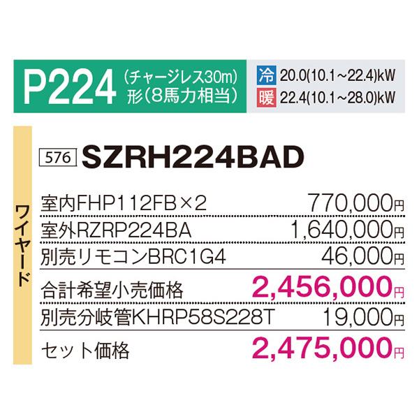 カテゴリ 業務用エアコン 型番 SZRH224BAD 定価 2,722,500円 販売価格 税込 668,000円 送料 東京・神奈川全域:無料(一部地域や離島を除く) 詳細 ■メーカー:ダイキン ■モデル名:2023年モデル ■タイプ名:パッケージエアコン / 天井吊り形1方向 / Eco ZEAS / 標準タイプ / ツイン(室内機2台×室外機1台) ■能力:8馬力(P224形) /【平米数】132~195㎡ /【坪数】40~59坪 /【畳数】80~118畳 ■電源:三相200V ■室内機:FHP112FB ×2 ■室外機:RZRP224BA ●室内機サイズ:235mm×1590mm×690mm ●室外機サイズ:1430mm×940mm×320mm ■その他機能等 ・ワイヤード ・スマート学習節電 ・除湿冷房 ・フォーシーズン制御 ・快適エコ除湿制御 ・快速冷暖モード ・ホットスタート(除霜後) ・水内部クリーン ・抗菌・防カビフィルター ※記載された情報は商品仕様の一部ですので、詳細はメーカーサイトにてご確認ください。 ※標準取付工事のほか、家電量販店では対応困難な『隠ぺい配管工事』も承ります。