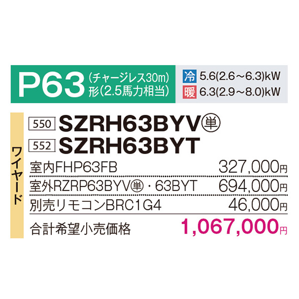 カテゴリ 業務用エアコン 型番 SZRH63BYV / SZRH63BYT 定価 1,173,700円 販売価格 税込 289,000円 送料 東京・神奈川全域:無料(一部地域や離島を除く) 詳細 ■メーカー:ダイキン ■モデル名:2023年モデル ■タイプ名:パッケージエアコン / 天井吊り形1方向 / Eco ZEAS / 標準タイプ / シングル(室内機1台×室外機1台) ■能力:2.5馬力(P63形) /【平米数】37~55㎡ /【坪数】11~16坪 /【畳数】22~32畳 ■電源:単相200V / 三相200V ■室内機:FHP63FB ■室外機:RZRP63BYV / RZRP63BYT ●室内機サイズ:235mm×1270mm×690mm ●室外機サイズ:610mm×795mm×300mm ■その他機能等 ・ワイヤード ・スマート学習節電 ・除湿冷房 ・フォーシーズン制御 ・快適エコ除湿制御 ・快速冷暖モード ・ホットスタート(除霜後) ・水内部クリーン ・抗菌・防カビフィルター ※記載された情報は商品仕様の一部ですので、詳細はメーカーサイトにてご確認ください。 ※標準取付工事のほか、家電量販店では対応困難な『隠ぺい配管工事』も承ります。