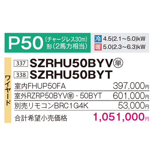 カテゴリ 業務用エアコン 型番 SZRHU50BYV / SZRHU50BYT 定価 1,156,100円 販売価格 税込 284,000円 送料 東京・神奈川全域:無料(一部地域や離島を除く) 詳細 ■メーカー:ダイキン ■モデル名:2023年モデル ■タイプ名:パッケージエアコン / 天井吊り形1方向 / スタイリッシュフロー / Eco ZEAS / シングル(室内機1台×室外機1台) ■能力:2馬力(P50形) /【平米数】29~43㎡ /【坪数】8~13坪 /【畳数】16~26畳 ■カラー:ブラック ■電源:単相200V / 三相200V ■室内機:FHUP50FA ■室外機:RZRP50BYV / RZRP50BYT ●室内機サイズ:高さ210mm×幅1180mm×奥行630mm ●室外機サイズ:高さ610mm×幅795mm×奥行300mm ■その他機能等 ・ワイヤード ・スマート学習節電 ・フォーシーズン制御 ・風量エコ自動制御 ・快速冷暖モード ・余熱再利用運転 ・2セレクトサーモ ・ホットスタート(除霜後) ・抗菌・防カビフィルター ※記載された情報は商品仕様の一部ですので、詳細はメーカーサイトにてご確認ください。 ※標準取付工事のほか、家電量販店では対応困難な『隠ぺい配管工事』も承ります。