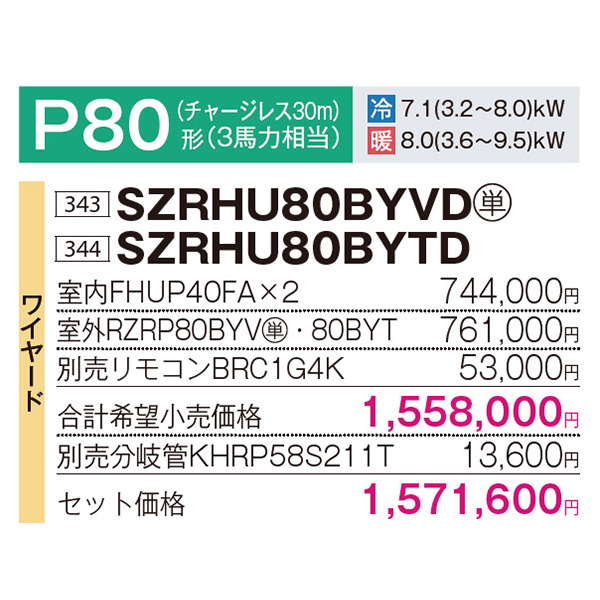 カテゴリ 業務用エアコン 型番 SZRHU80BYVD / SZRHU80BYTD 定価 1,728,760円 販売価格 税込 425,000円 送料 東京・神奈川全域:無料(一部地域や離島を除く) 詳細 ■メーカー:ダイキン ■モデル名:2023年モデル ■タイプ名:パッケージエアコン / 天井吊り形1方向 / スタイリッシュフロー / Eco ZEAS / ツイン(室内機2台×室外機1台) ■能力:3馬力(P80形) /【平米数】47~70㎡ /【坪数】14~21坪 /【畳数】28~42畳 ■カラー:ブラック ■電源:単相200V / 三相200V ■室内機:FHUP40FA x2 ■室外機:RZRP80BYV / RZRP80BYT ●室内機サイズ:高さ210mm×幅1180mm×奥行630mm ●室外機サイズ:高さ610mm×幅795mm×奥行300mm ■その他機能等 ・ワイヤード ・スマート学習節電 ・フォーシーズン制御 ・風量エコ自動制御 ・快速冷暖モード ・余熱再利用運転 ・2セレクトサーモ ・ホットスタート(除霜後) ・抗菌・防カビフィルター ※記載された情報は商品仕様の一部ですので、詳細はメーカーサイトにてご確認ください。 ※標準取付工事のほか、家電量販店では対応困難な『隠ぺい配管工事』も承ります。
