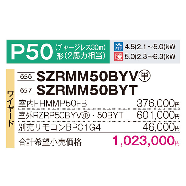 カテゴリ 業務用エアコン 型番 SZRMM50BYV / SZRMM50BYT 定価 1,125,300円 販売価格 税込 277,000円 送料 東京・神奈川全域:無料(一部地域や離島を除く) 詳細 ■メーカー:ダイキン ■モデル名:2023年モデル ■タイプ名:パッケージエアコン / ダクト形 / Eco ZEAS / 標準タイプ / シングル(室内機1台×室外機1台) ■能力:2馬力(P50形) /【平米数】29~43㎡ /【坪数】8~13坪 /【畳数】16~26畳 ■電源:単相200V / 三相200V ■室内機:FHMMP50FB ■室外機:RZRP50BYV / RZRP50BYT ●室内機サイズ:高さ245mm×幅700mm×奥行800mm ●室外機サイズ:高さ610mm×幅795mm×奥行300mm ■通年エネルギー消費効率:5 ■その他機能等 ・ワイヤード ・スマート学習節電 ・風量エコ自動制御 ・フォーシーズン制御 ・高温みまもり運転 ・快速冷暖モード ・ホットスタート(除霜後) ・マイコンドライ ・清潔アルミフィン ※記載された情報は商品仕様の一部ですので、詳細はメーカーサイトにてご確認ください。 ※標準取付工事のほか、家電量販店では対応困難な『隠ぺい配管工事』も承ります。