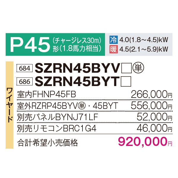カテゴリ 業務用エアコン 型番 SZRN45BYV / SZRN45BYT 定価 1,012,000円 販売価格 税込 249,000円 送料 東京・神奈川全域:無料(一部地域や離島を除く) 詳細 ■メーカー:ダイキン ■モデル名:2023年モデル ■タイプ名:パッケージエアコン / コンパクト4方向 / Eco ZEAS / マルチフロータイプ / ショーカセ / シングル(室内機1台×室外機1台) ■能力:1.8馬力(P45形) /【平米数】26~39㎡ /【坪数】7~11坪 /【畳数】14~22畳 ■電源:単相200V / 三相200V ■室内機:FHNP45FB ■室外機:RZRP45BYV / RZRP45BYT ●室内機サイズ:高さ260mm×幅650mm×奥行650mm(天井ふところ必要寸法:265mm以上) ●室外機サイズ:高さ610mm×幅795mm×奥行300mm ■その他機能等 ・ワイヤード ・設定温度自動復帰 ・高温みまもり運転 ・フォーシーズン制御 ・快速冷暖モード ・風向選択 ・オートスイング ・マイコンドライ ・2セレクトサーモ ※記載された情報は商品仕様の一部ですので、詳細はメーカーサイトにてご確認ください。 ※標準取付工事のほか、家電量販店では対応困難な『隠ぺい配管工事』も承ります。