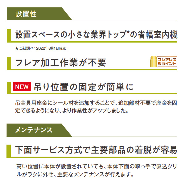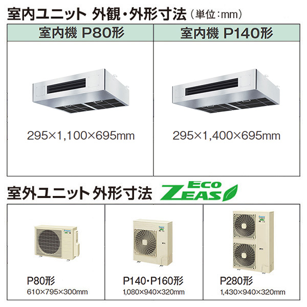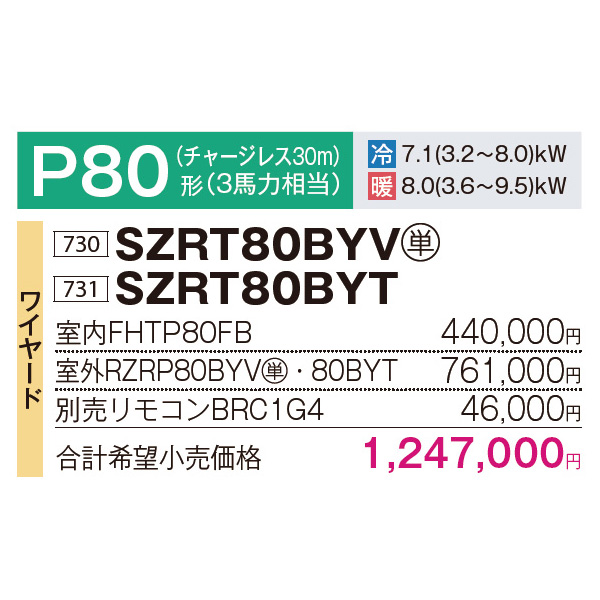カテゴリ 業務用エアコン 型番 SZRT80BYV / SZRT80BYT 定価 1,371,700円 販売価格 税込 337,000円 送料 東京・神奈川全域:無料(一部地域や離島を除く) 詳細 ■メーカー:ダイキン ■モデル名:2023年モデル ■タイプ名:パッケージエアコン / 厨房用 / Eco ZEAS / シングル(室内機1台×室外機1台) ■能力:3馬力(P80形) /【平米数】47~70㎡ /【坪数】14~21坪 /【畳数】28~42畳 ■電源:単相200V / 三相200V ■室内機:FHTP80FB ■室外機:RZRP80BYV / RZRP80BYT ●室内機サイズ:高さ295mm×幅1100mm×奥行695mm ●室外機サイズ:高さ610mm×幅795mm×奥行300mm ■その他機能等 ・ワイヤード ・高温みまもり運転 ・フォーシーズン制御 ・2セレクトサーモ ・快速冷暖モード ・余熱再利用運転 ・ホットスタート(除霜後) ・清潔アルミフィン ・抗菌・防カビフィルター ※記載された情報は商品仕様の一部ですので、詳細はメーカーサイトにてご確認ください。 ※標準取付工事のほか、家電量販店では対応困難な『隠ぺい配管工事』も承ります。