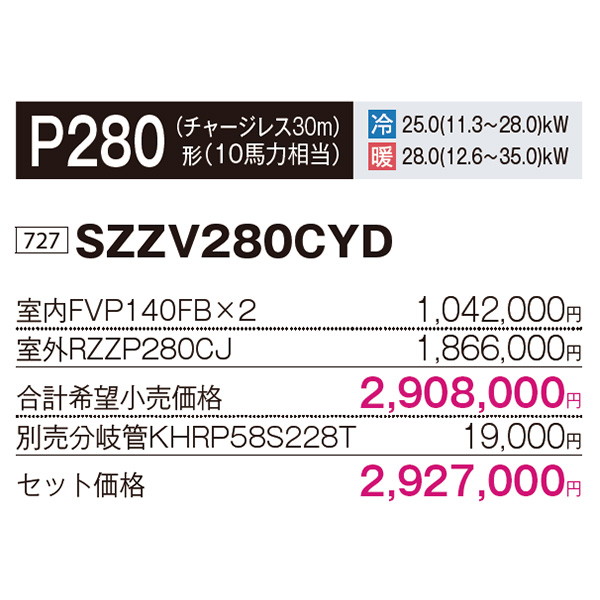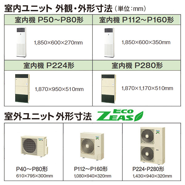カテゴリ 業務用エアコン 型番 SZZV280CYD 定価 3,219,700円 販売価格 税込 790,000円 送料 東京・神奈川全域:無料(一部地域や離島を除く) 詳細 ■メーカー:ダイキン ■モデル名:2023年モデル ■タイプ名:パッケージエアコン / 床置き形 / Eco ZEAS / ツイン(室内機2台×室外機1台) ■能力:10馬力(P280形) /【平米数】165~243㎡ /【坪数】50~73坪 /【畳数】100~146畳 ■電源:三相200V ■室内機:FVP140FB x2 ■室外機:RZZP280CJ ●室内機サイズ:高さ1850mm×幅600mm×奥行350mm ●室外機サイズ:高さ1430mm×幅940mm×奥行320mm ■その他機能等 ・ワイヤード ・スマート学習節電 ・フォーシーズン制御 ・風量エコ自動制御 ・快速冷暖モード ・余熱再利用運転 ・マイコンドライ ・ホットスタート(除霜後) ・抗菌・防カビフィルター ※記載された情報は商品仕様の一部ですので、詳細はメーカーサイトにてご確認ください。 ※標準取付工事のほか、家電量販店では対応困難な『隠ぺい配管工事』も承ります。