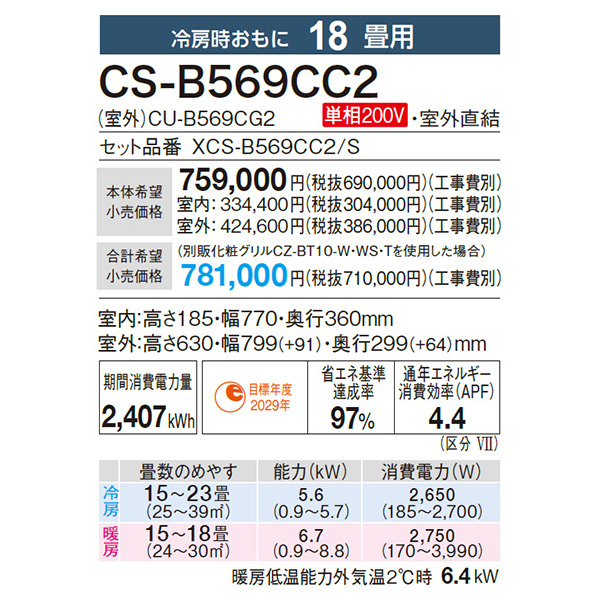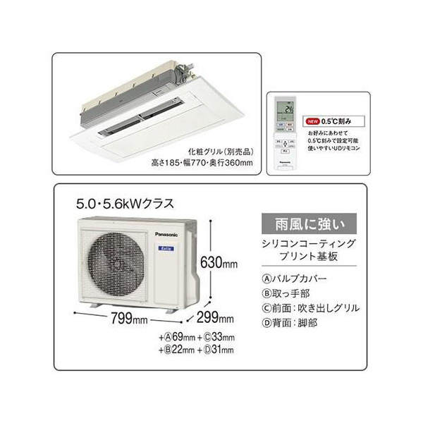 カテゴリ ハウジングエアコン 型番 XCS-B569CC2-S 定価 710,000円 販売価格 税込 285,000円 詳細 ■メーカー:パナソニック ■タイプ名:天井ビルトイン1方向 ■適用畳数:18畳用 ■カラー:化粧グリル:CZ-BT10-W(ホワイト) / CZ-BT10-WS(スーパーホワイト) / CZ-BT10-T(ブラウン) / CZ-BT10-M(木目調) ■電源:単相200V ■室内機:CS-B569CC2 ■室外機:CU-B569CG2 ●室内機サイズ:高さ185mm×幅770mm×奥行360mm ●室外機サイズ:高さ630mm×幅799(+91)mm×奥行299(+64)mm ■期間消費電力量(年間):2407kWh ■その他機能等 ・室外電源 ・コンプレッサー(ハイパーウェーブロータリー) ・スイング冷房 ・冷房除湿 ・パワフルモード ・においカット ・内部クリーン ・2モード除湿(標準/弱) ・除菌/脱臭フィルター(交換めやす約10年) ※記載された情報は商品仕様の一部ですので、詳細はメーカーサイトにてご確認ください。 ※標準取付工事のほか、家電量販店では対応困難な『隠ぺい配管工事』も承ります。